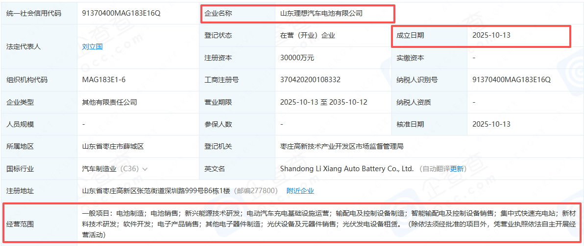 企查查信息显示,10月13日,山东理想汽车电池有限公司(简称“理想电池”)正式成立,法定代表人刘立国,注册资本3亿元人民币。