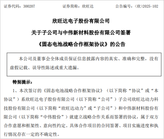 欣旺达表示,欣旺达动力与中伟股份签署本协议有利于双方建立长期战略合作,发挥各自优势形成协同效应。通过联合开发新型正极材料前驱体,直接应对固态电池在能量密度、安全性和循环寿命方面的核心技术挑战,对公司固态电池的研发产生积极影响,有助于进一步提高公司研发技术能力、综合竞争力,共同推进新能源产业链的发展。