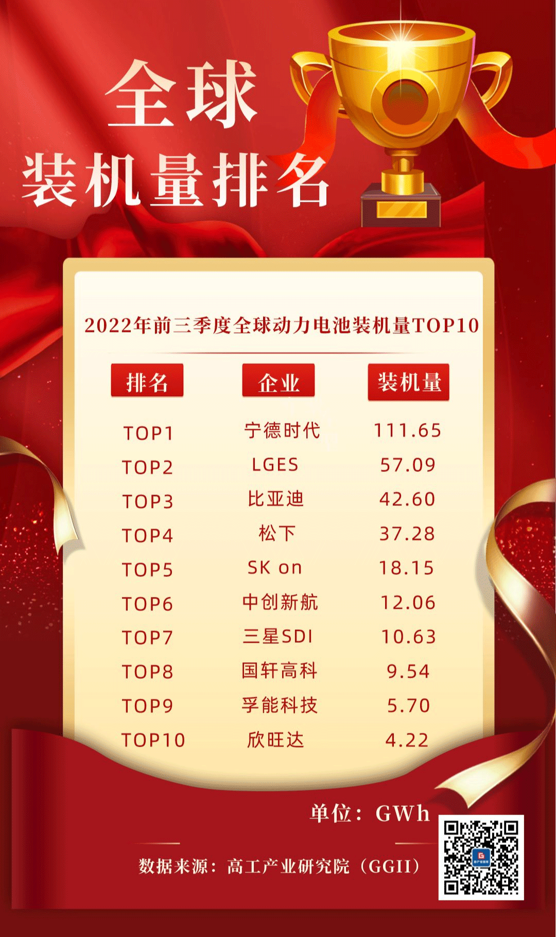 『榜单』2022年前三季度全球动力电池装机量TOP10