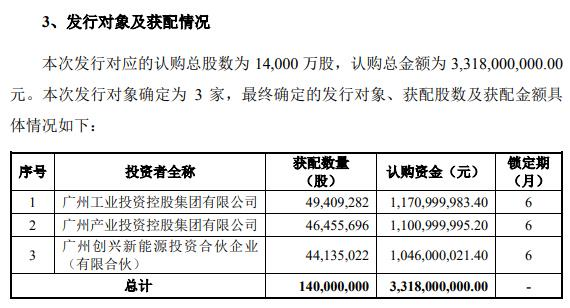 该公告显示,截至2022年11月2日止,孚能科技已向特定投资者发行股票 1.4亿股,募集资金总额33.18亿元 ,扣除不含税发行费用6151.97万元,实际募集资金净额为32.56亿元。 本次发行对象最终确定为3家,分别为广州工控、广州产控、创兴新能源,认购资金分别为11.71亿元、11.01亿元和10.46亿元,对应获配股数分别为0.49亿股、0.46亿股和0.44亿股。